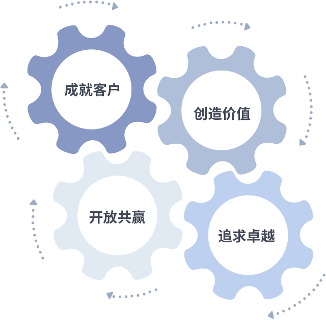 成就客户是一切决策的出发点,,,,创造价值是衡量所有工作的标准,,追求卓越是我们做事做人的态度,,,开放共赢是我们的格局也是最终的结果。。。价值观的齿轮环环相扣,,推动着组织里的每个人不断向前。。。。